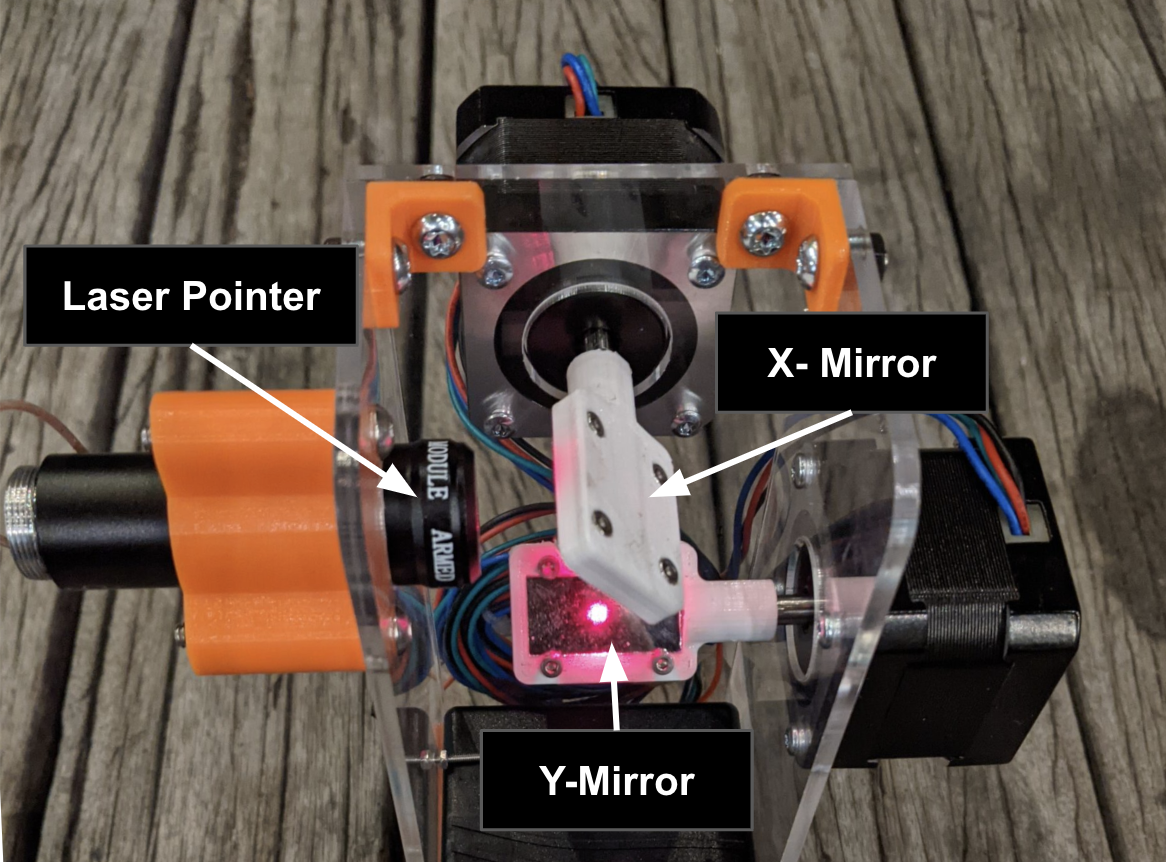 The beam originates from a laser pointer and bounces off two mirrors that are rotated independently using stepper motors. These mirrors steer the beam in the X and Y directions.