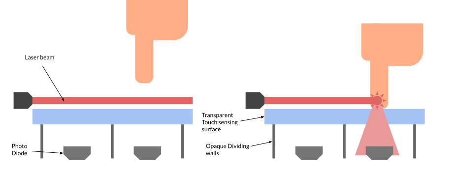 When the surface is touched, the beam is obstructed and diffused at the touch-spot, which is picked up by the photodiode and the touch is mapped to the photo diode’s location.
