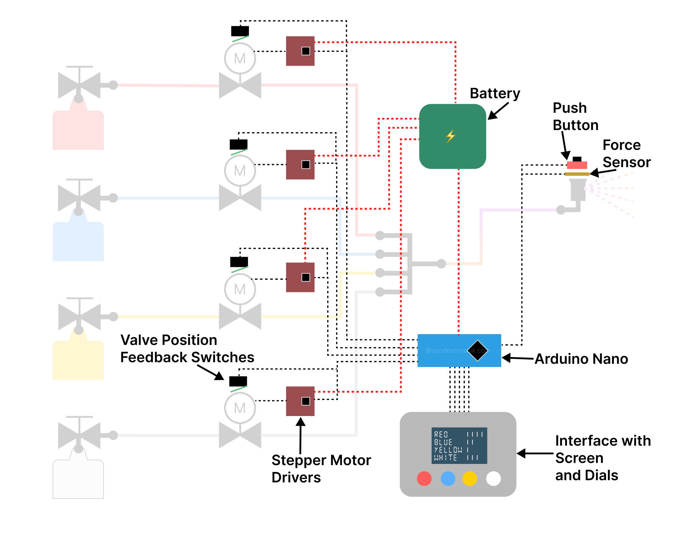 An Arduino Nano serves as the system's brain, reading inputs from the control panel and spray trigger, then controlling the stepper motor drivers that operate each valve with precise pulse timing.