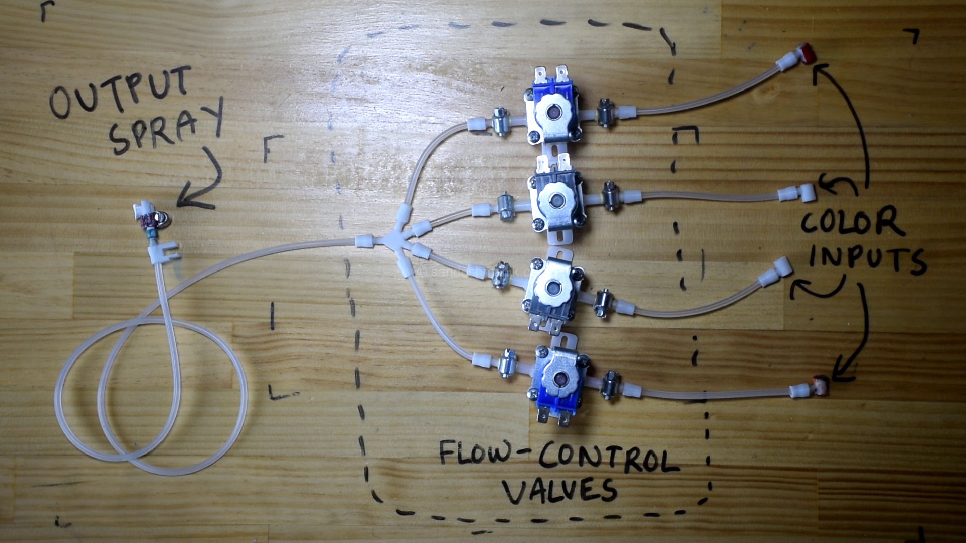 I rigged up a simple test: valves would alternate between colors in rapid pulses, with color ratios controlled by how long each pulse lasted. I sprayed onto white paper, expecting to see distinct stripes of color since there was no mixing channel. Instead, they mixed beautifully. The turbulence from the alternating pulses in the narrow tube was intense enough to completely blend the color bursts before they exited the nozzle. And of course, no back-flow issues since only one can was ever open at a time.