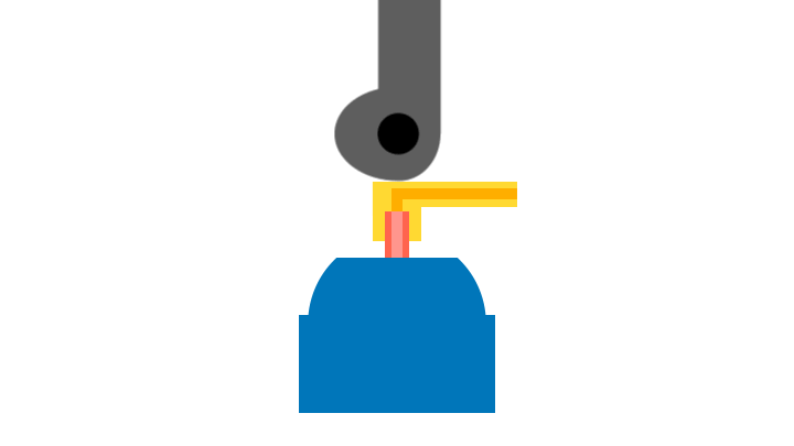 How it Works: A motor-powered lever pinches flexible silicone tubing against a wall to stop paint flow. A bearing at the lever's tip prevents wear as it rolls over the tube. When the lever rotates down, it pinches closed; rotating back releases the flow. The paint stays inside the tube and never touches the mechanism—no clogging.