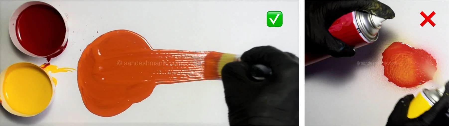 Comparison: making orange with red and yellow regular paint vs spray paint.