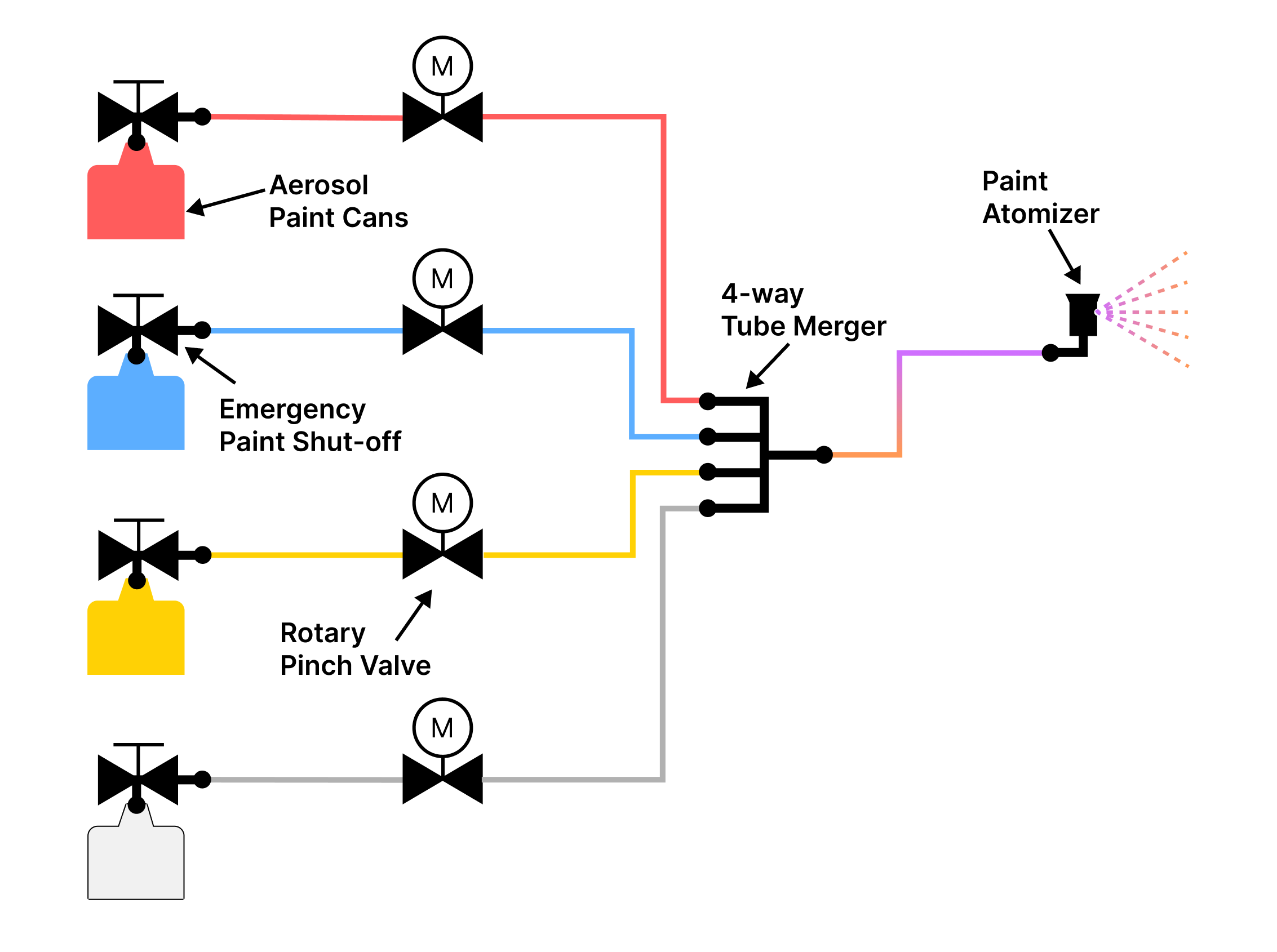 The valves solved the core technical challenge, but I still needed to build Spectrum around them. How do you safely tap into pressurized spray paint cans? How do you build a pipeline system with all the connectors to route paint from multiple cans through valves and merge them together? And critically—how do you prevent paint from spraying everywhere if something goes wrong?